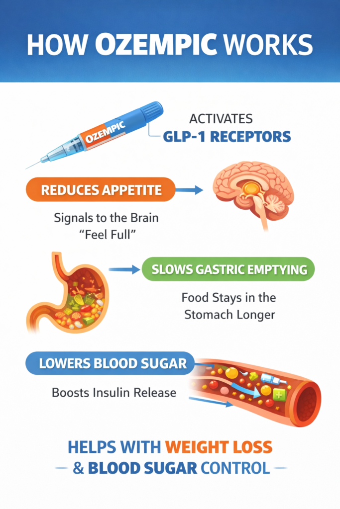 You take one injection per week (a tiny needle you barely feel), and it’s in your system regulating those hunger signals 24/7. You’re not relying on willpower anymore. The medication is doing the heavy lifting by normalizing your hunger hormones.
