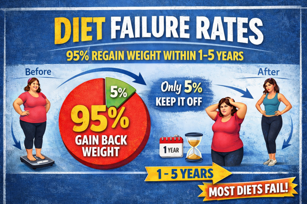 Studies show that 95% of people who lose weight through dieting alone regain it within 1-5 years. Most regain MORE than they lost.